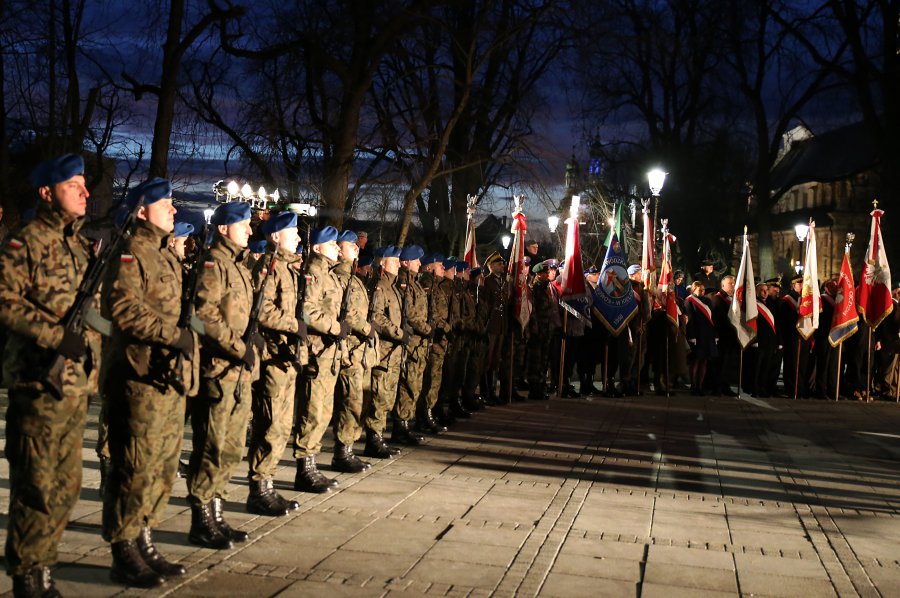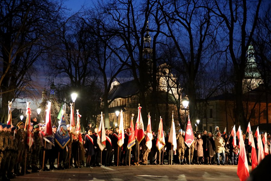 O godz. 17.30 uroczystości rozpoczęły się przed Pomnikiem Armii Krajowej. Na miejscu, Dyrektor Generalny Świętokrzyskiego Urzędu Wojewódzkiego Paweł Lubieniecki odczytał list od Prezydenta RP Andrzeja Dudy. – „Heroiczna walka Żołnierzy Wyklętych była kolejnym aktem w dziejowym dramacie zmagań o wolną Polskę. Wobec braku realnych szans powodzenia i nadziei na zmianę położenia politycznego kraju, jej dramatyzm przypomina sytuację znaną z historii powstańców styczniowych. Zarazem zaś niezłomna postawa tych ostatnich obrońców suwerennej Rzeczypospolitej, jednoznacznie wskazuje na najważniejsze dla naszego narodu wartości, które my, Polacy, cenimy wyżej niż własne życie: wolność i honor, solidarność z bliźnimi i poświęcenie dla sprawy narodowej” – napisał Prezydent Andrzej Duda. Wojewoda Agata Wojtyszek podkreśliła, jak ważne miejsce na mapie walk o wolność ma województwo świętokrzyskie. - Żołnierze Wyklęci walczyli na naszej rodzinnej Kielecczyźnie. Jesteśmy dumni, że region ten wydał na świat tak wielu polskich patriotów, których dziś możemy stawiać za wzór naszym dzieciom i wnukom. Narodowy Dzień Pamięci Żołnierzy Wyklętych to symbol pamięci nie tylko o tych, którzy zginęli i nie doczekali wolnej Ojczyzny, ale również świadectwo patriotyzmu dla następnych pokoleń. Prawda bowiem jest tylko jedna. Z serca dziękuję za troskę o to, by bohaterscy żołnierze podziemia niepodległościowego znaleźli dziś godne miejsce w pamięci potomnych – mówiła wojewoda, która odczytała także specjalny list od Prezesa Rady Ministrów Beaty Szydło oraz przekazała wyrazy szacunku i sympatii od szefowej Rządu dla uczestników uroczystości. O idei Narodowego Dnia Pamięci Żołnierzy Wyklętych opowiedziała natomiast dr Dorota Koczwańska-Kalita, naczelnik Delegatury Instytutu Pamięci Narodowej w Kielcach.