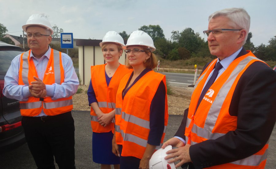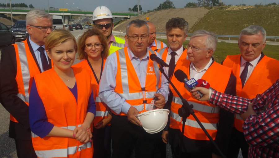 Briefing z udziałem Ministra Infrastruktury i Budownictwa Andrzeja Adamczyka oraz wojewody Agaty Wojtyszek i wicewojewody Andrzeja Bętkowskiego odbył się w Mierzawie, na budowanym odcinku drogi ekspresowej S7 Jędrzejów – granica województwa.
