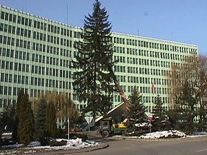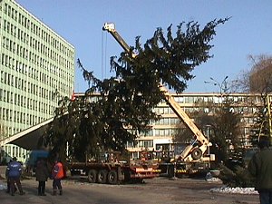 Święta już blisko! Przed gmachem urzędu wojewódzkiego stanęła okazała choinka Prawie 30-metrowego świerka przywieziono z okolic Skarżyska-Kamiennej. Atrakcyjna dekoracja "drzewka" jest zasługą pracowników Zakładu Obsługi ŚUW.