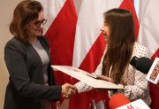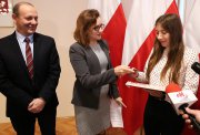 Paszport wraz z pakietem na 100-lecie niepodległości otrzymała z rąk wojewody Agaty Wojtyszek 18-letnia Agata Marchewka ze Skarżyska-Kamiennej.