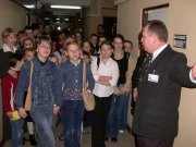 Podczas wizyty dzieci zwiedziły Świętokrzyski Urząd Wojewódzki - Biuro Zarządzania Funduszami Europejskimi, salę konferencyjną w "Okrąglaku", a na koniec obejrzały panoramę Kielc z VII piętra budynku. Najwięcej radości przyniosła im wizyta w Wydziale Zarządzania Kryzysowego. Wicewojewoda Joanna Grzela razem ze Sławomirem Pastuszką, zastępcą dyrektora Biura Zarządzania Funduszami Europejskimi opowiedzieli o strukturze i zadaniach Urzędu. Rozmawiano o Unii Europejskiej. Młodzi ludzie zadawali wiele pytań, min. o zainteresowania i hobby wicewojewody, jej obowiązki, a nawet o stopnie, jakie miała w szkole. Dzieci podziękowały Joannie Grzeli za spotkanie. Obdarowały wicewojewodę pamiątkowym listem, tomikiem wierszy, które same napisały oraz własnoręcznie wykonanymi pracami plastycznymi.