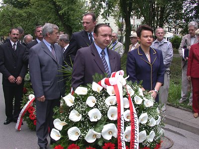 W 58 rocznicę pogromu Żydów w Kielcach, przed pamiątkową tablicą wmurowaną w ścianę kamienicy przy ul. Planty 7, kwiaty złożyli Joanna Grzela, wicewojewoda świętokrzyski oraz Sławomir Neugebauer, dyrektor generalny Świętokrzyskiego Urzędu Wojewódzkiego.