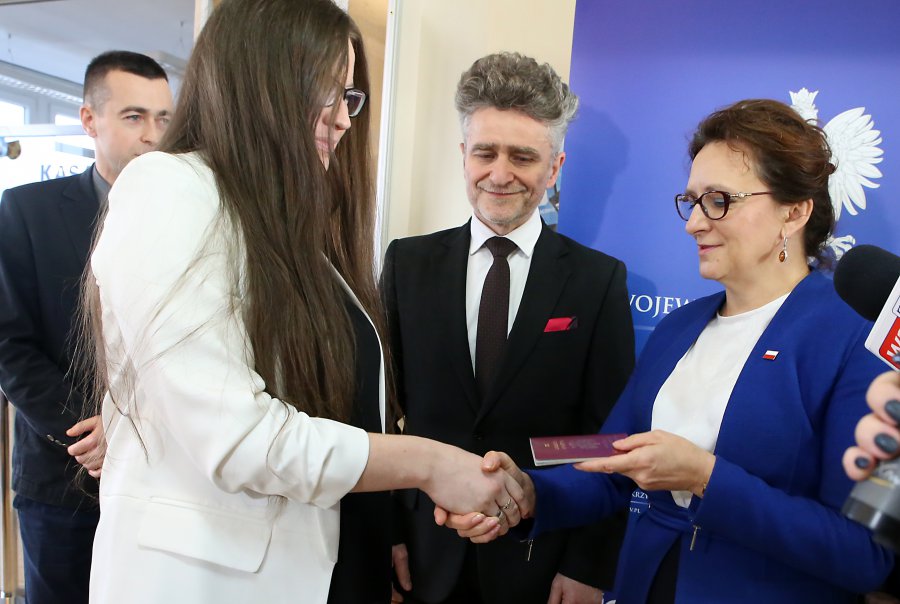 - Wniosków o nowy paszport wpłynęło do nas już ponad 1800. Dziś wręczamy dokument pani Karolinie. Serdecznie gratulujemy, jest to paszport zawierający symbole niepodległościowe, które zostały wybrane przez Polaków. Na uwagę zasługuje ponadto fakt, że zabezpieczenia tego paszportu są naprawdę wysokiej klasy. Wręczamy dziś paszport w taki symboliczny sposób, aby również przypomnieć, że składany wniosek wiąże się z tym, że otrzymamy dokument będący znakiem stulecia naszej niepodległości – mówiła wojewoda Agata Wojtyszek.