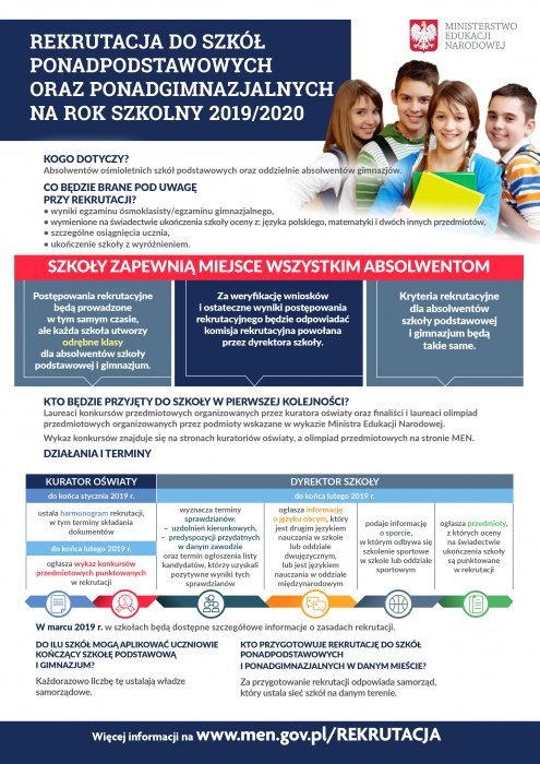 Szczegółowe informacje dotyczące rekrutacji na rok szkolny 2019/2020 dostępne są na stronie MEN www.men.gov.pl/rekrutacja