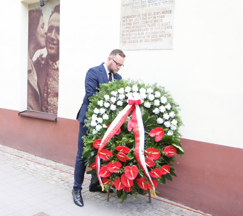 Pamięć o tych tragicznych wydarzeniach sprzed lat wciąż żywa jest w mieszkańcach naszego regionu, dlatego przed pamiątkową tablicą wmurowaną w ścianę kamienicy przy ul. Planty 7 w Kielcach złożono symboliczne kwiaty, które w imieniu wojewody Agaty Wojtyszek przekazał dyrektor generalny urzędu wojewódzkiego – Paweł Lubieniecki.