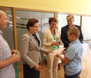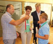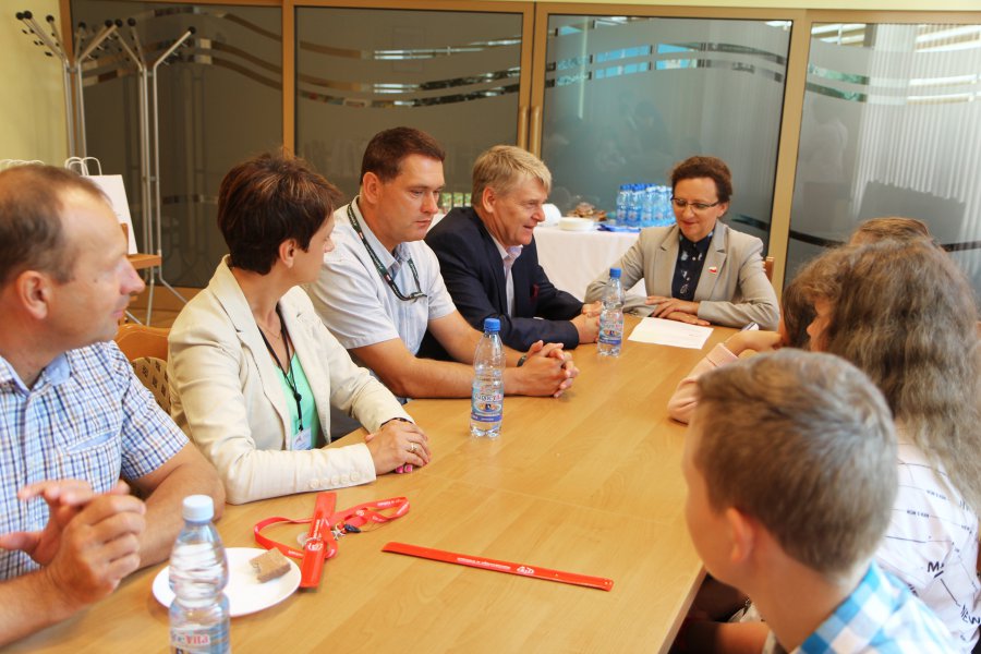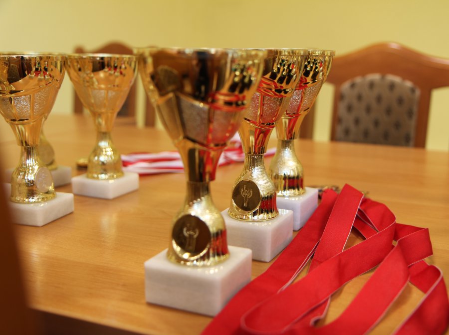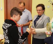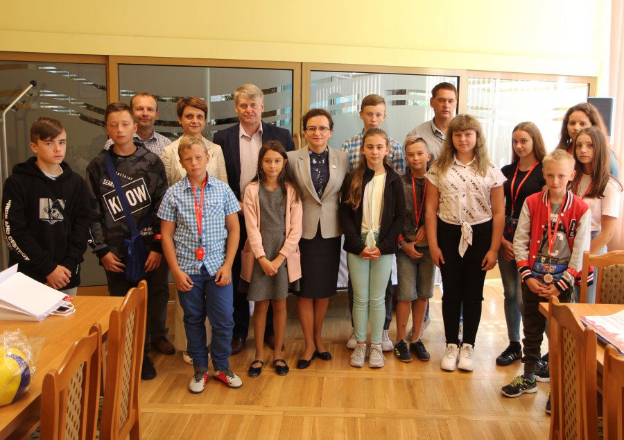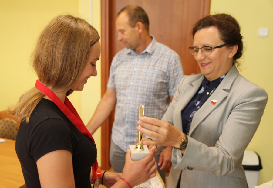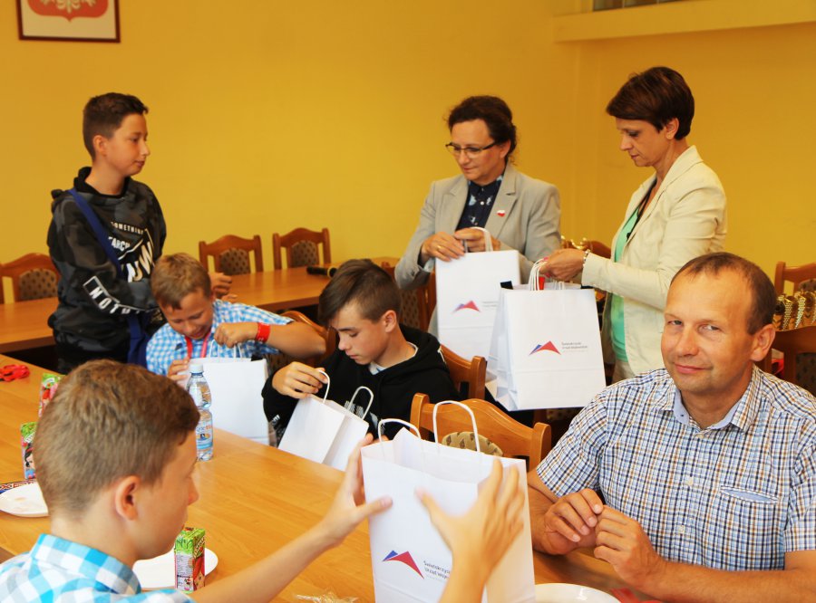 Po zapoznaniu się z pracą urzędu, uczniowie otrzymali od wojewody Agaty Wojtyszek drobne upominki z logo Świętokrzyskiego Urzędu Wojewódzkiego w Kielcach. Podczas spotkania wojewoda wręczyła również swoim gościom wyróźnienia w postaci pucharów i medali, które uczniowie zdobyli podczas sierpniowego obozu sportowego w Jastarni. Zawody podczas wyjazdu zorganizowane zostały aż w 8 kategoriach.