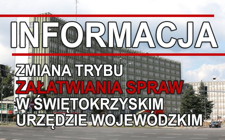 Informuję, że w dalszym ciągu nie będzie możliwości samodzielnego poruszania się po urzędzie, w tym celu większość spraw realizowana będzie na parterze budynku Świętokrzyskiego Urzędu Wojewódzkiego. Każdy klient odbierany będzie przez urzędnika przy głównych drzwiach urzędu (budynek A), a po zakończeniu spotkania ponownie do nich odprowadzany.