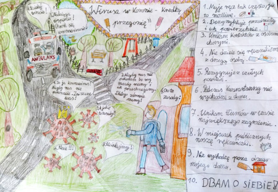 Konkurs skierowano do uczniów klas I-III świętokrzyskich szkół podstawowych, a zadaniem jego uczestników było wykonanie rysunków przedstawiających zachowania związane z walką z koronawirusem - mycie rąk, noszenie maseczek czy pozostanie w domu i kreatywne spędzanie czasu.