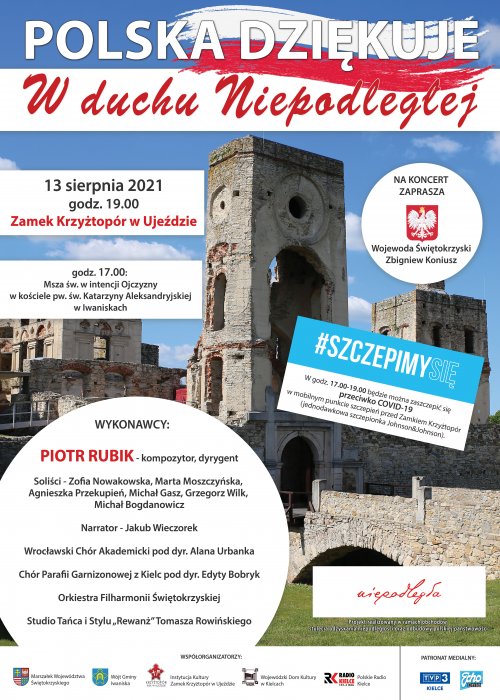 Przed koncertem – o godz. 17.00 – w kościele parafialnym w Iwaniskach rozpocznie się msza św. w intencji ojczyzny. W Ujeździe prowadzona będzie ponadto, z inicjatywy wojewody, akcja szczepień przeciwko COVID-19. W godz. 17.00-19.00, w mobilnym punkcie szczepień przed zamkiem Krzyżtopór, wszyscy chętni otrzymają jednodawkową szczepionkę Johnson&Johnson.