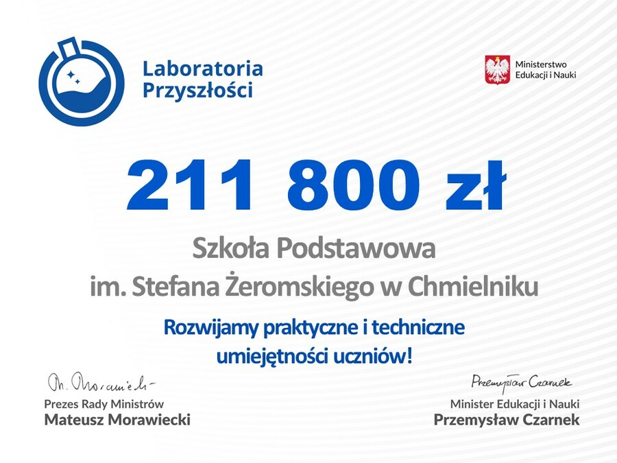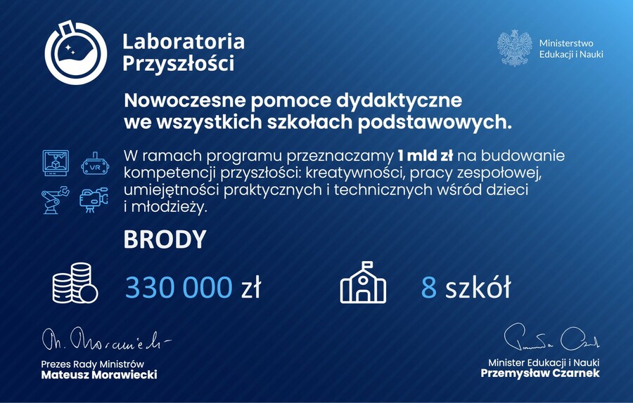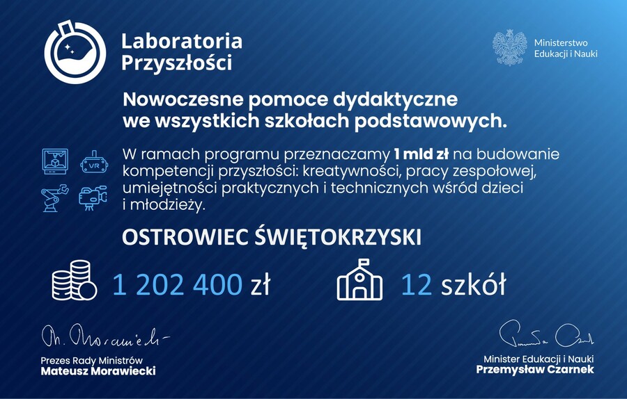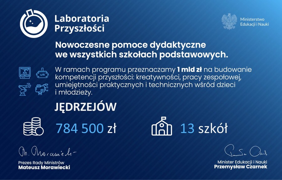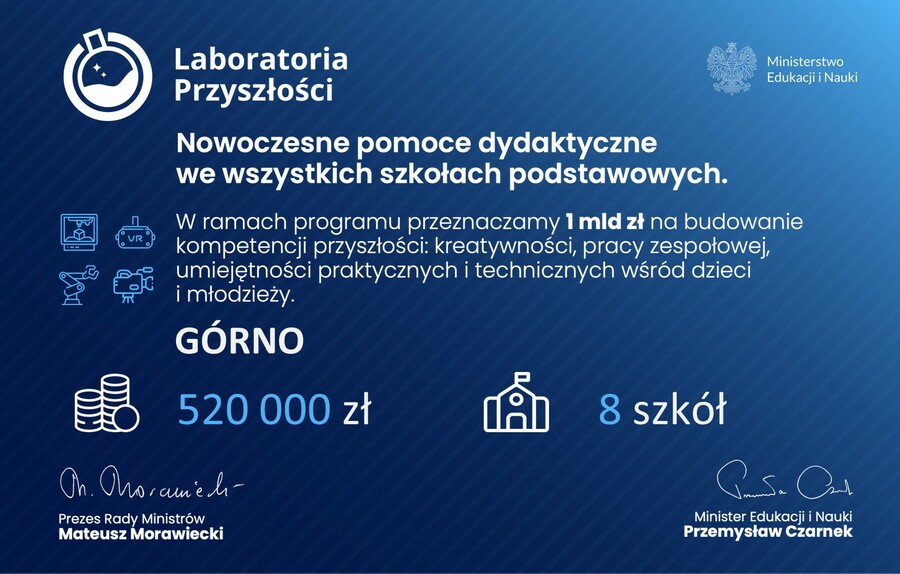Realizowany od jesieni 2021 roku program "Laboratoria Przyszłości" to największa w historii inwestycja w nowoczesną edukację. Dzięki rządowemu wsparciu szkoły zostały wyposażone w zaawansowany sprzęt, taki jak drukarki 3D, roboty edukacyjne czy gogle wirtualnej rzeczywistości.
