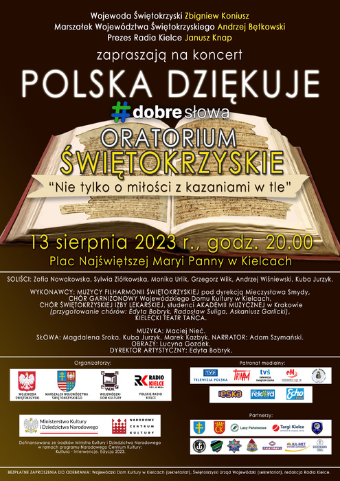 Na koncert „Polska dziękuje #dobresłowa” z Oratorium Świętokrzyskim „Nie tylko o miłości z kazaniami w tle” zaprasza wojewoda Zbigniew Koniusz. Artystyczne wydarzenie rozpocznie się 13 sierpnia o godz. 20.00 na placu Najświętszej Maryi Panny w Kielcach.