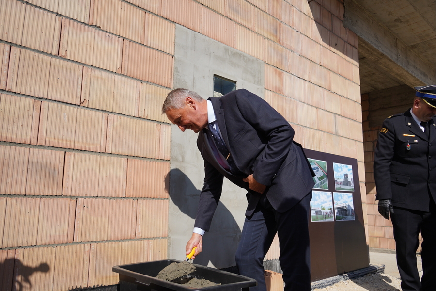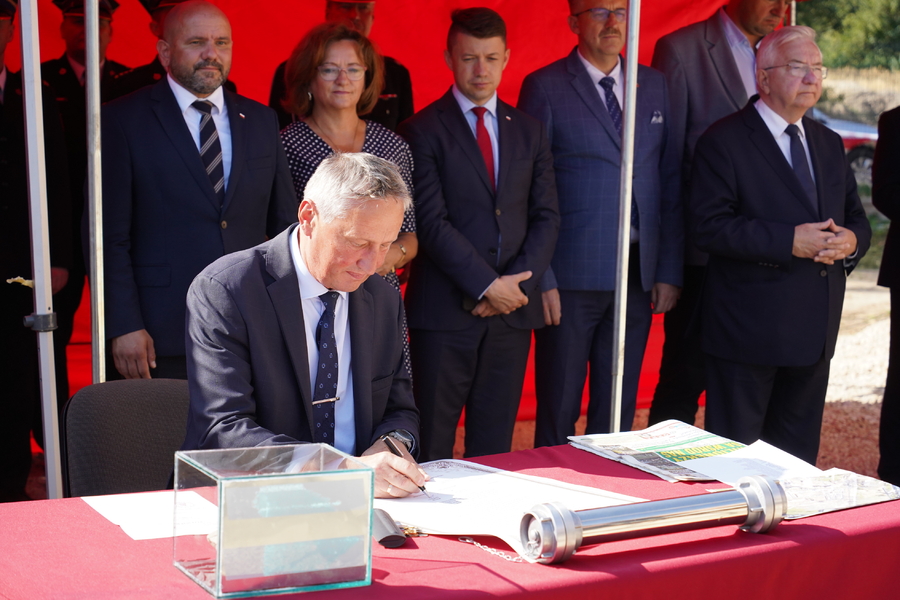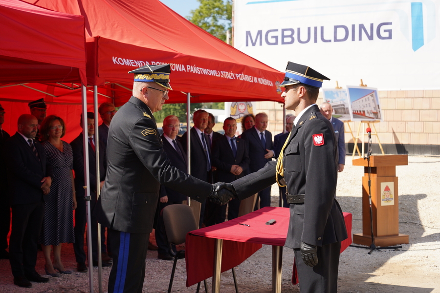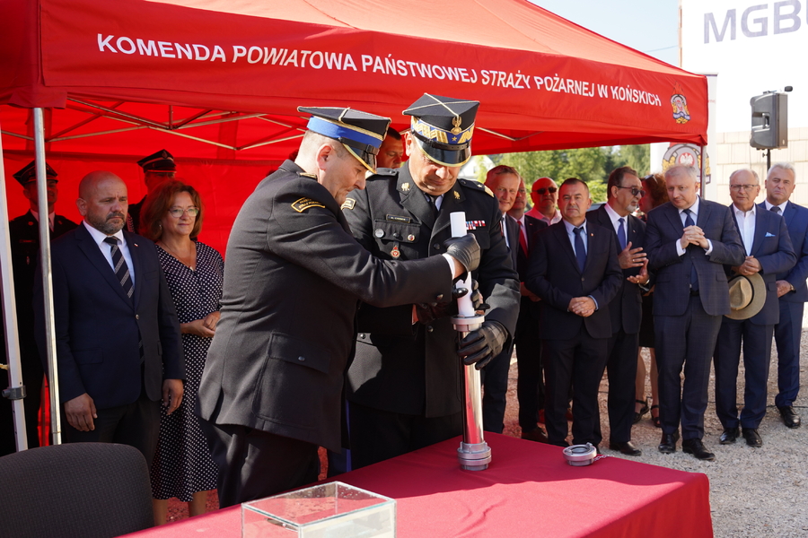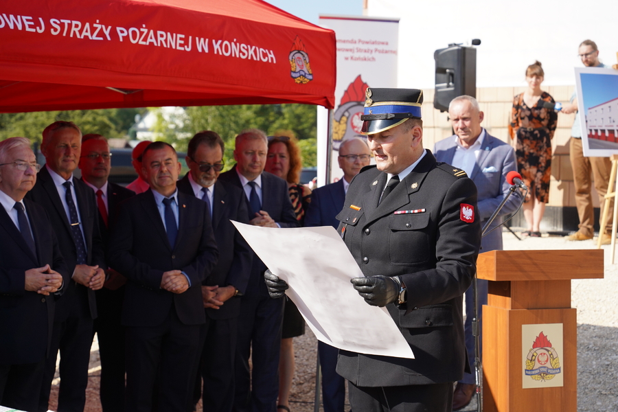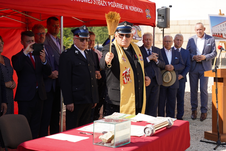 Wojewoda Świętokrzyski Zbigniew Koniusz wziął udział w uroczystości wmurowania kamienia węgielnego pod budowę nowej strażnicy Komendy Powiatowej Państwowej Straży Pożarnej przy ulicy Warszawskiej w Końskich.