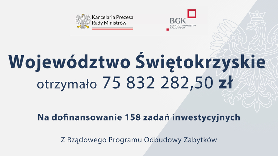 Województwo świętokrzyskie w drugiej edycji Rządowego Programu Odbudowy Zabytków otrzymało na realizację 158 inwestycji kwotę 75 milionów 832 282,50 zł.