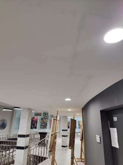 Z powodu gałęzi i liści zalegających na budynku B, zatkane zostały odpływy na dachu i woda przesiąknęła do "Okrąglaka". Na szczęście nie ucierpiał żaden z obrazów, które wystawione są w naszej galerii sztuki.