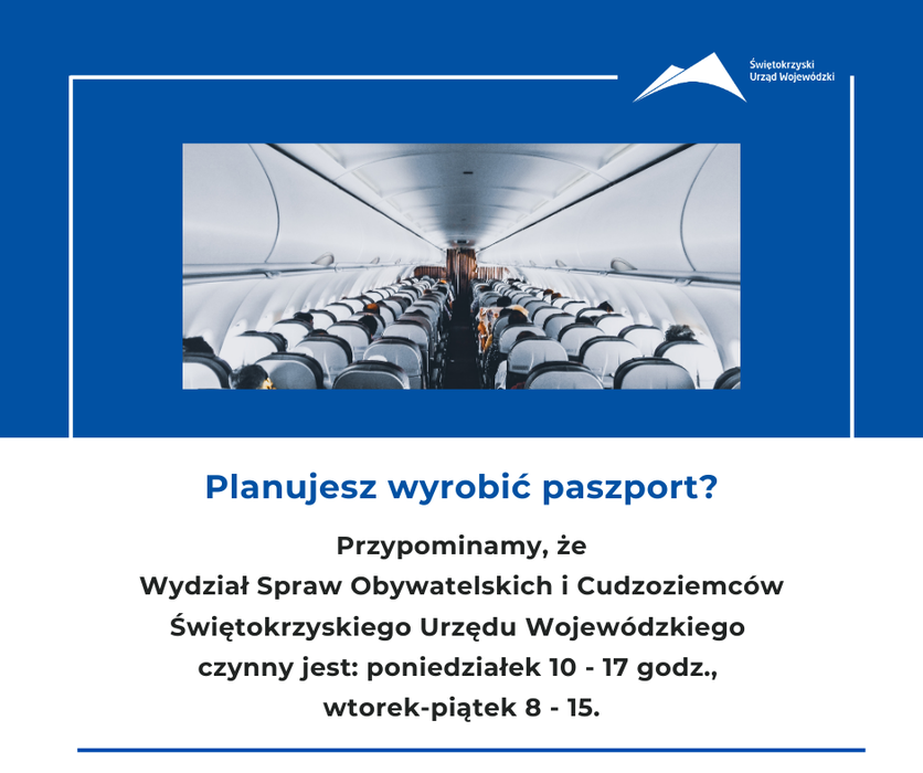 Planujesz wyrobić paszport? Przypominamy, że w poniedziałki wydział Spraw Obywatelskich i Cudzoziemców Świętokrzyskiego Urzędu Wojewódzkiego pracuje w godzinach od 10 do 17. W pozostałe dni tygodnia w godzinach od 8 do 15.