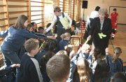 W dzisiejszych zajęciach pomagali wojewodzie funkcjonariusze z Wydziału Ruchu drogowego Komendy Wojewódzkiej Policji w Kielcach oraz ratownicy medyczni ze Świętokrzyskiego Okręgu Polskiego Czerwonego Krzyża. Specjaliści uczyli dzieci prawidłowych zachowań na jezdni oraz udzielania pierwszej pomocy przedmedycznej. Praktyczne zajęcia zakończyła wojewoda rozdając wszystkim opaski odblaskowe oraz specjalne breloki zawierające instrukcję udzielania pierwszej pomocy.