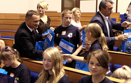 Grupa gości z polskiej szkoły z Nowej Wilejki, wraz z goszczącymi ją przedstawicielami Zespołu Szkół Ekonomicznych im. Mikołaja Kopernika oraz Szkoły Podstawowej nr 28 w Kielcach, zwiedziła budynek Świętokrzyskiego Urzędu Wojewódzkiego. Punktem kulminacyjnym spaceru było spotkanie w sali konferencyjnej w "okrąglaku", podczas którego wicewojewoda opowiadał dzieciom o pracy w urzędzie oraz zachwalał najpiękniejsze zakątki województwa świętokrzyskiego.