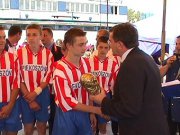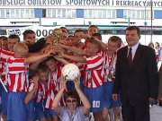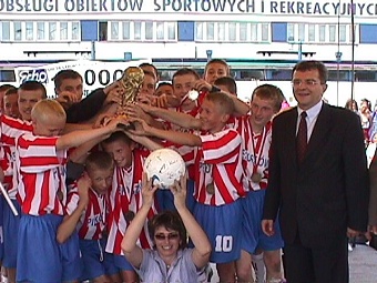 Włodzimierz Wójcik - Wojewoda Świętokrzyski wręczył zwycięzcom Minimundialu 2002 - drużynie gimnazjum w Piekoszowie, reprezentującej Paragwaj - "Świętokrzyską Nike", trofeum wykonane na wzór pucharu świata