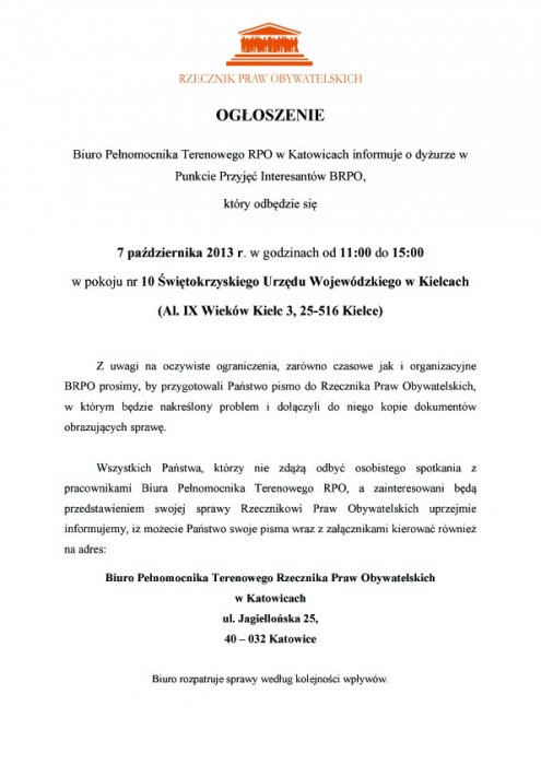 Dyżur RPO - Aktualności - Świętokrzyski Urząd Wojewódzki w Kielcach