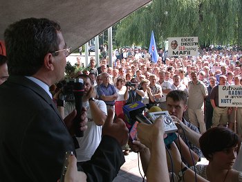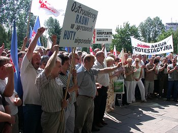 Około 400 hutników demonstrowało dziś przed budynkiem Świętokrzyskiego Urzędu Wojewódzkiego w Kielcach. Związkowcy domagają się zagwarantowania przez koncern "Celsa" zatrudnienia wszystkich osób pracujących obecnie na majątku upadłej Huty "Ostrowiec".