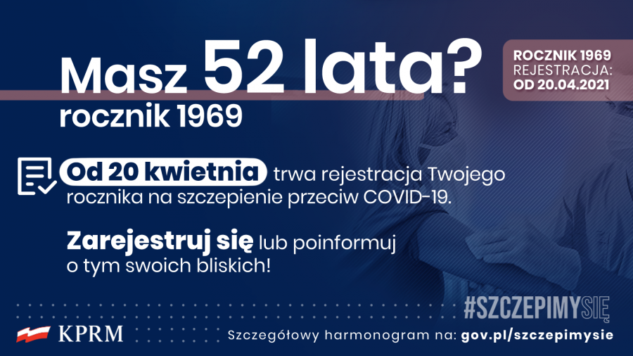 20 kwietnia wszyscy 52-latkowie mogą zapisać się na szczepienie – rejestracja online działa już od północy, a od godz. 6:00 rano – infolinia 989. Zarejestruj się i wybierz dogodny dla siebie termin przyjęcia szczepionki, która uchroni Cię przed groźną chorobą. Dzięki otwarciu kolejnych Punktów Szczepień Powszechnych o termin może być jeszcze łatwiej.
