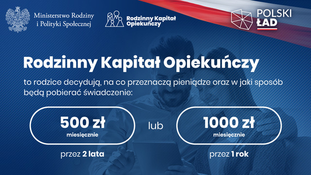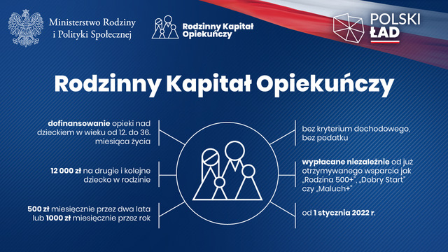Wsparcie rodziców w łączeniu życia rodzinnego z pracą zawodową to jeden z priorytetów rządu Prawa i Sprawiedliwości oraz jeden z kluczowych elementów Polskiego Ładu. Nowym instrumentem, który ma temu służyć, jest Rodzinny Kapitał Opiekuńczy. To 12 tys. zł na drugie i kolejne dziecko w wieku od ukończenia 12. do 36. miesiąca życia – niezależnie od dochodów. Świadczenie wypłacane będzie w kwocie 500 zł miesięcznie przez dwa lata lub 1000 zł miesięcznie przez rok. Wybór należy do rodziców. Rodzice sami zdecydują też, na co wydać pieniądze – np. żłobek, nianię czy samodzielną opiekę nad dzieckiem. Za obsługę procesu przyjmowania wniosków, a także przyznawania i wypłaty świadczenia odpowiadać będzie Zakład Ubezpieczeń Społecznych.